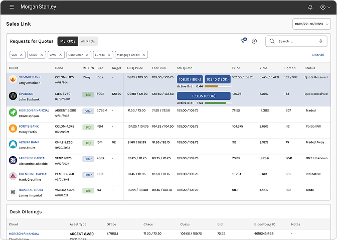 We designed a real-time quoting app for Morgan Stanley traders and sales reps, optimized for the trading floor. The interface cuts through noise and complexity so users can capture, respond to, and track bond quotes in seconds.