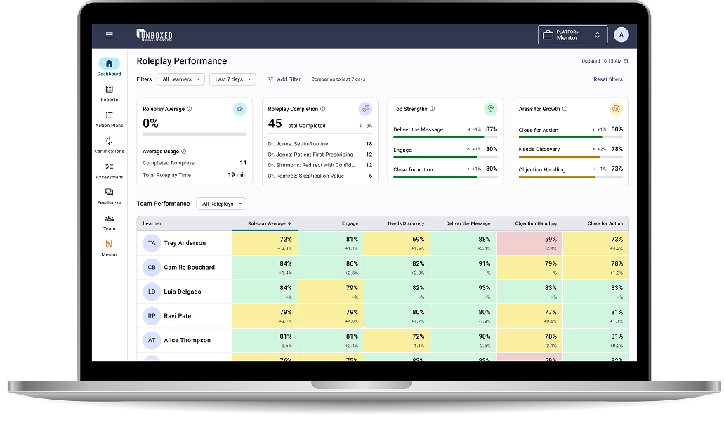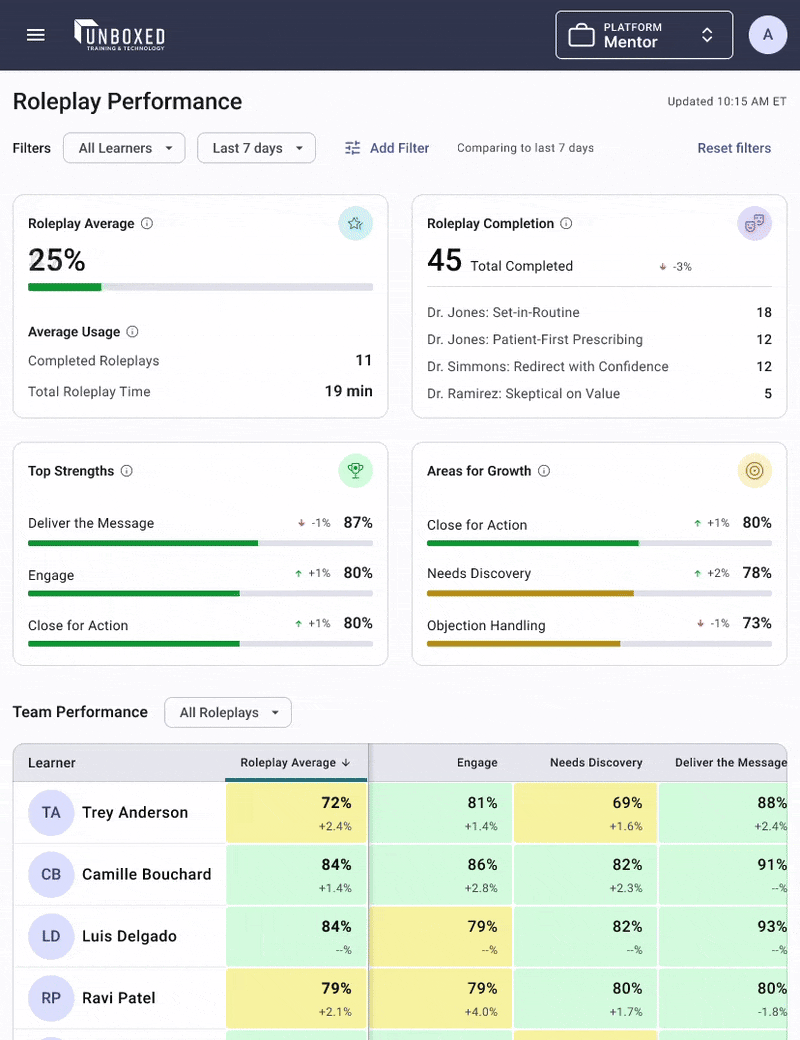 By consolidating all essential roleplay performance data onto a single dashboard page, we eliminated the need for navigating between screens. Combining critical insights with data visualizations, contextual insights in tooltips, and color-coded scoring, managers can quickly identify strengths and areas for improvement.