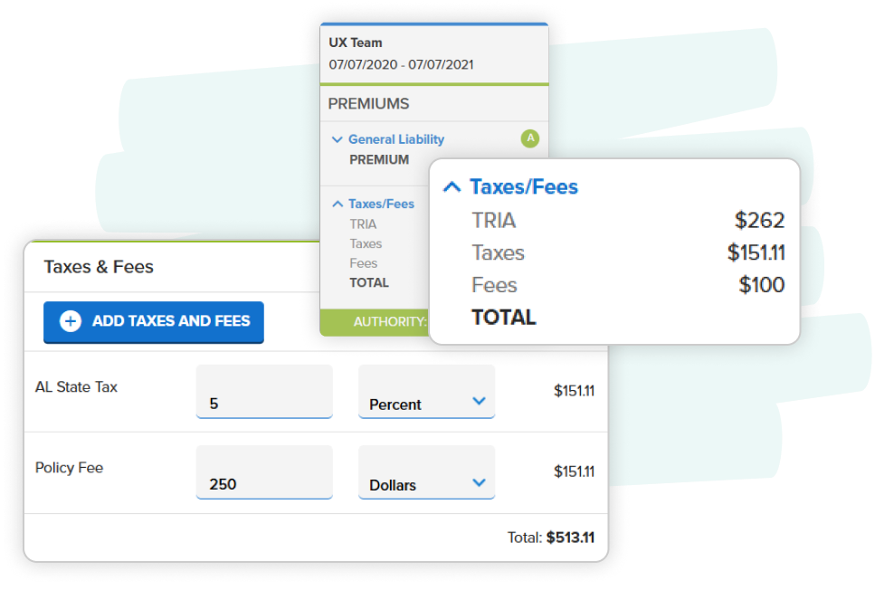 In our new design we added a ‘Taxes/Fees’ section in the premium summary. Each line item is auto-calculated based on the business’s physical location, ensuring the correct taxes and fees are being applied.