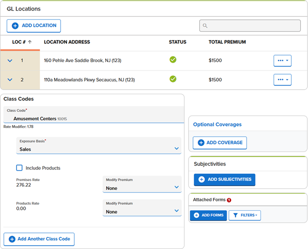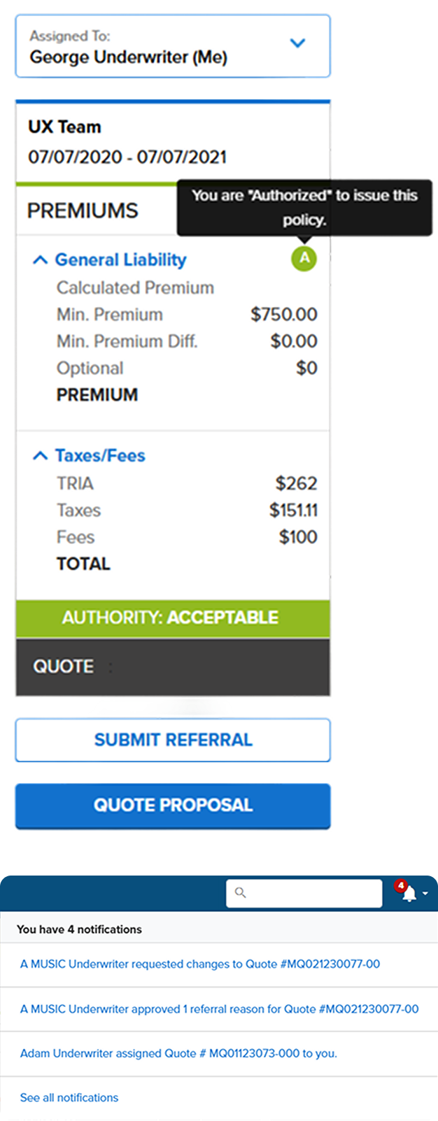 Once the visual design mockups were finalized, we developed a semi-functional Angular front-end prototype for usability testing with insurance agents. Overall, the designs performed well. However, testing revealed friction when adding options like location, building, and optional coverage to policies.
