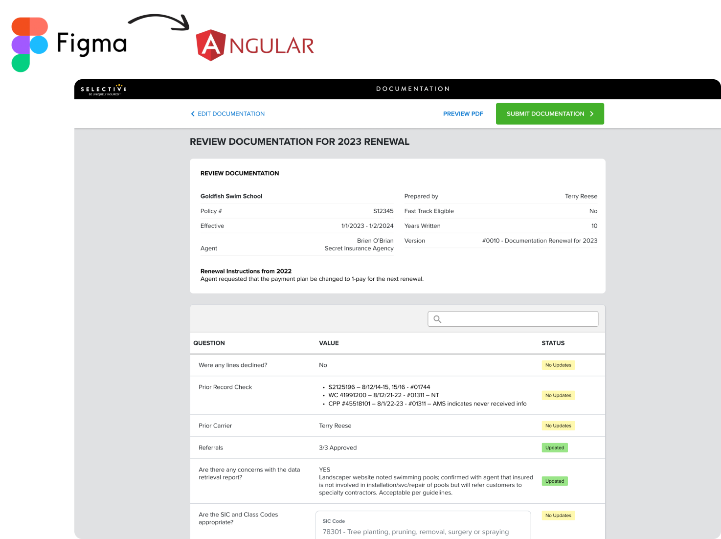 We transformed the Figma designs into a high-fidelity Angular prototype, delivering development-ready assets to Selective for integration. The redesigned web-based form replaced Microsoft Word documents, enabling underwriters and assistants to collaborate effortlessly in real time.